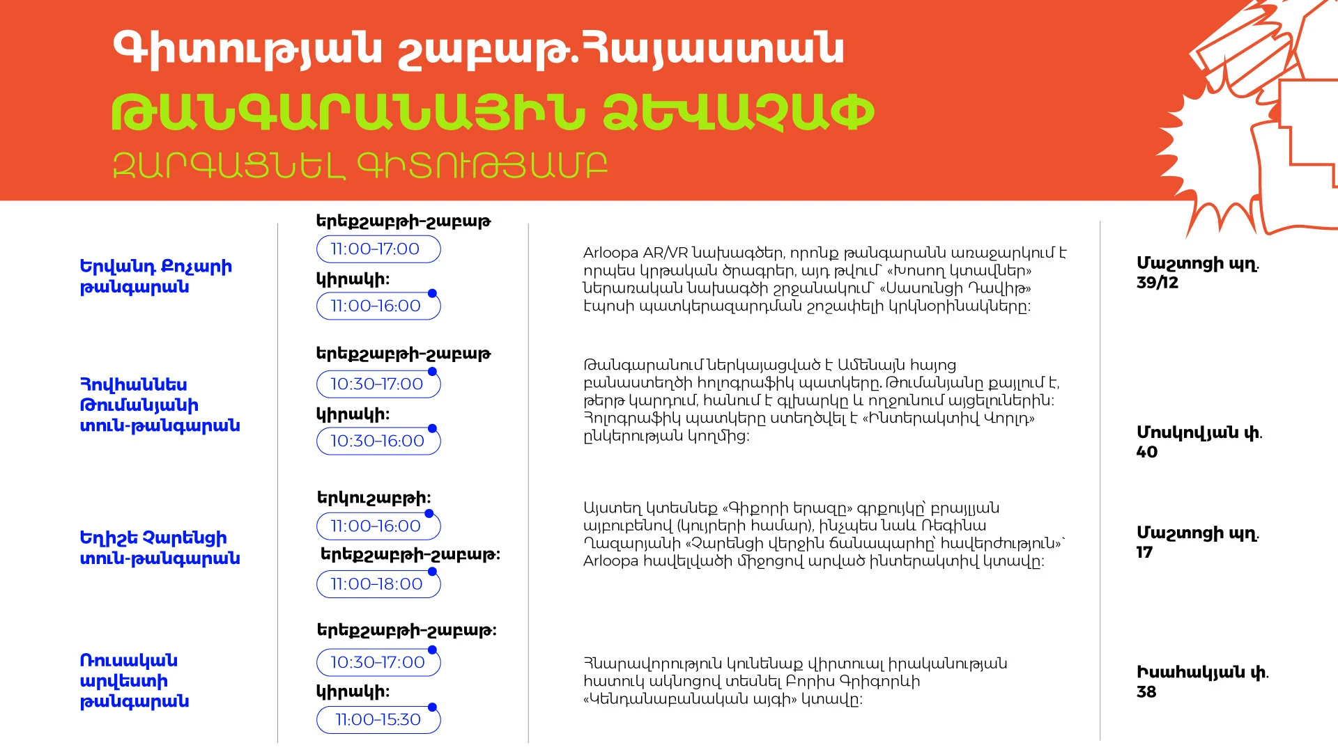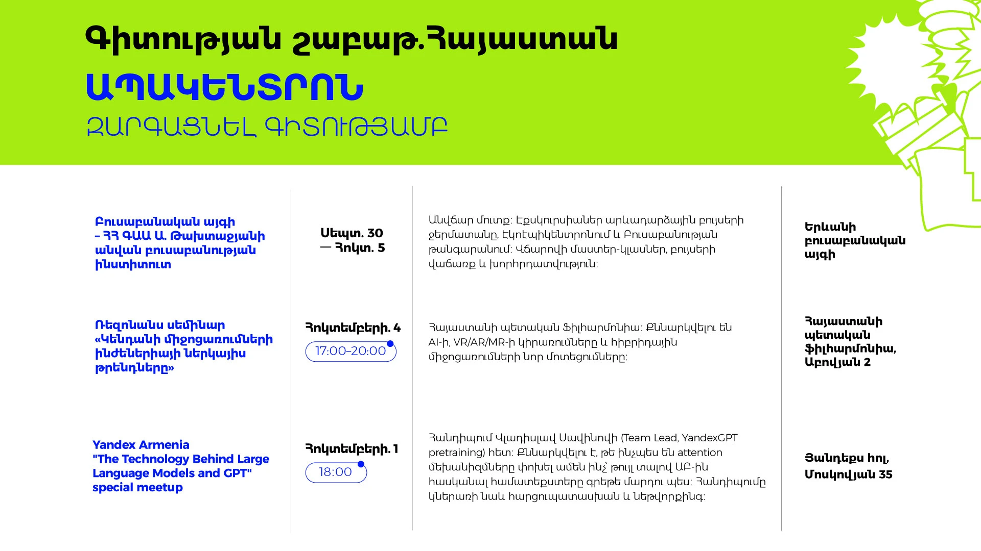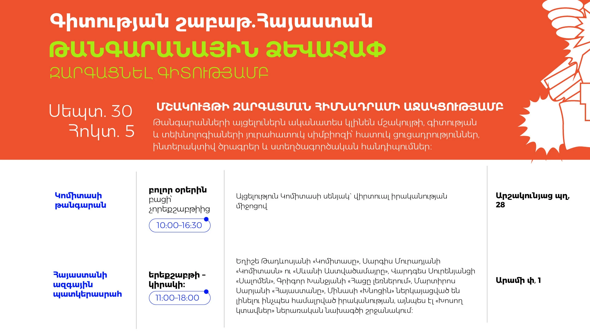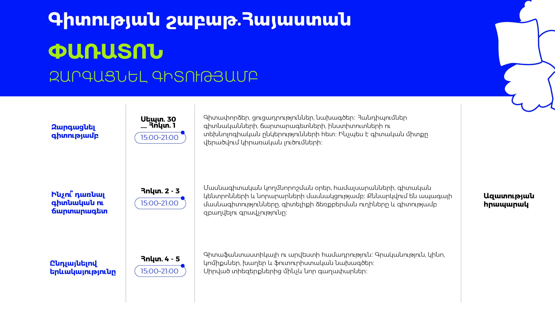 Այս օրերին գիտությունն ու տեխնոլոգիաները դուրս են գալիս լաբորատորիաներից ու համալսարաններից և ներկայանում լայն հասարակությանը։ Այցելուներին սպասում են ինտերակտիվ տաղավարներ, իրական ժամանակում անցկացվող գիտափորձեր, վարպետաց դասեր, խաղեր, ցուցադրություններ և հանդիպումներ մասնագետների հետ։