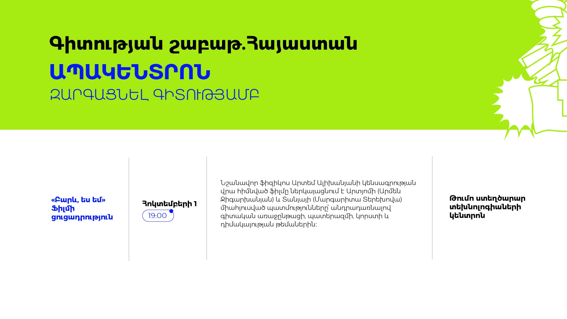 Համազգային գիտության շաբաթը Հայաստանում` Միացի՜ր մեր ուղևորությանը դեպի գիտության և տեխնոլոգիաների աշխարհը։ Բացահայտումները սկսվում են այնտեղ, ուր տանում է հետաքրքրասիրությունը։
